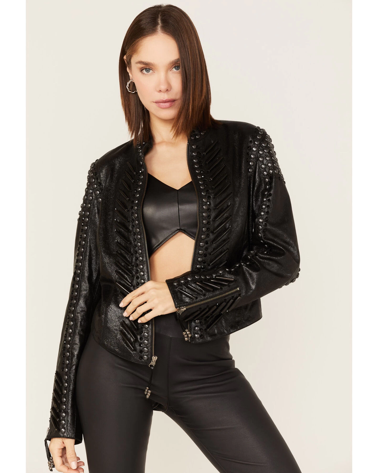 - Stud, crystal and hair pipe beaded embellishments on sleeves and front