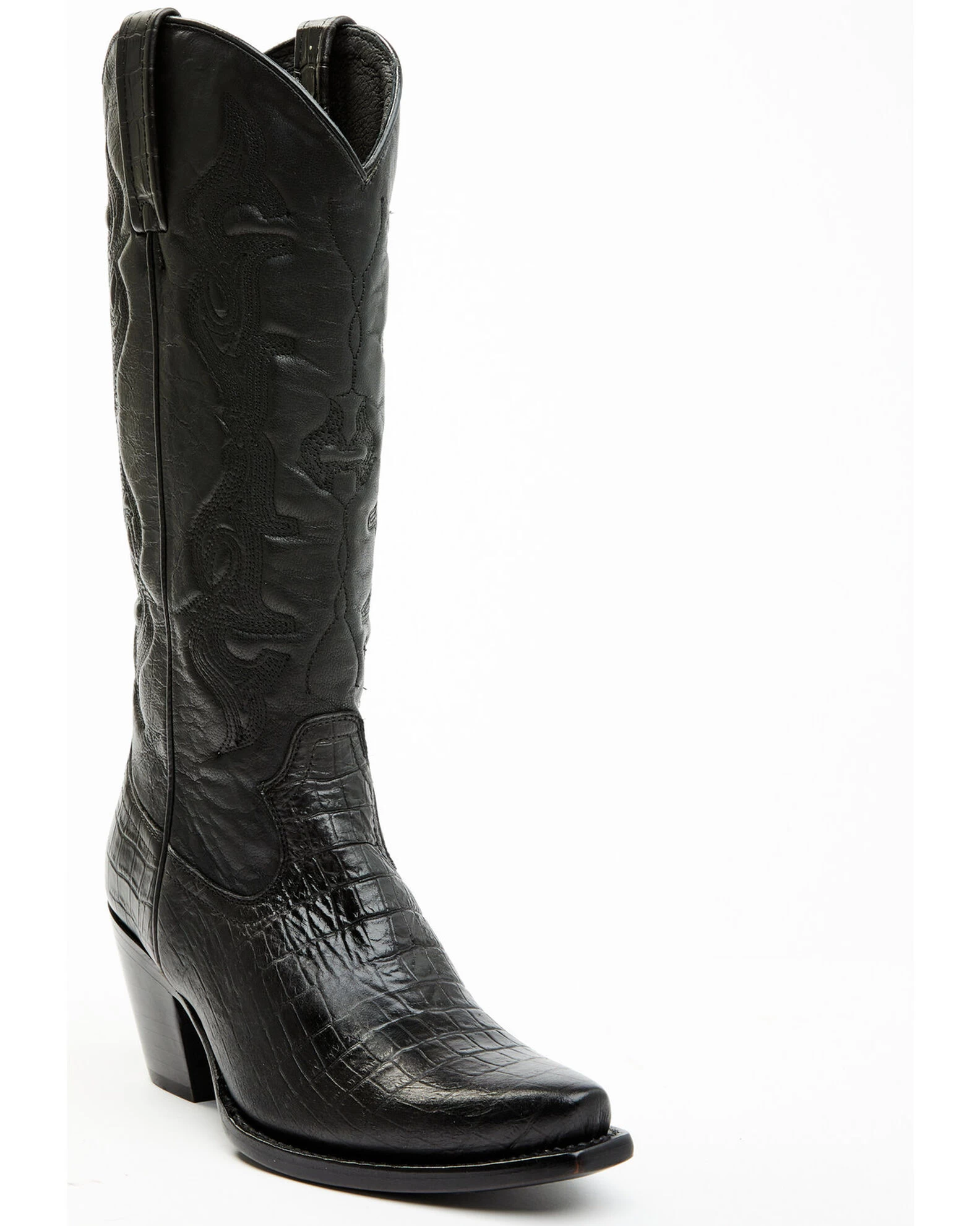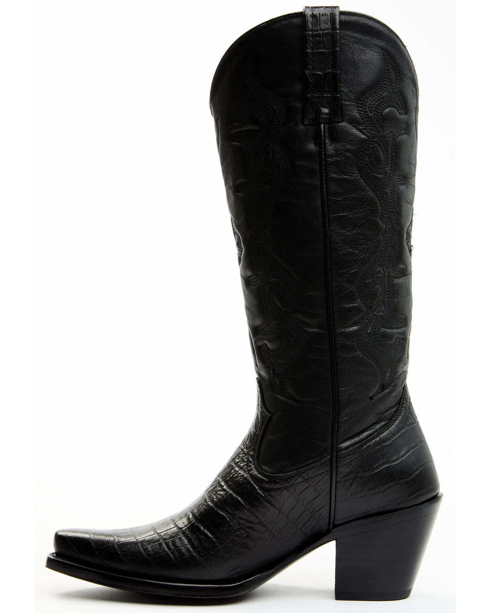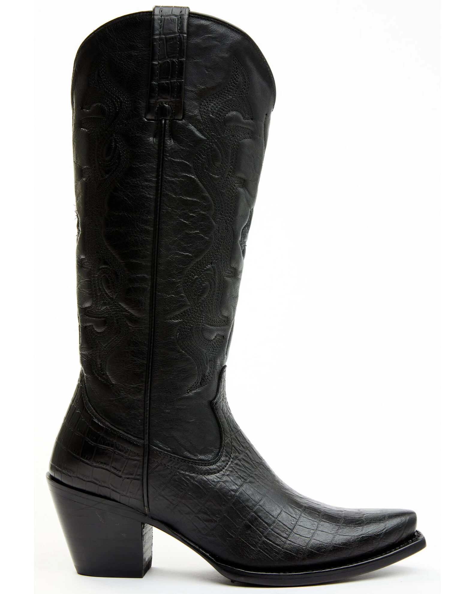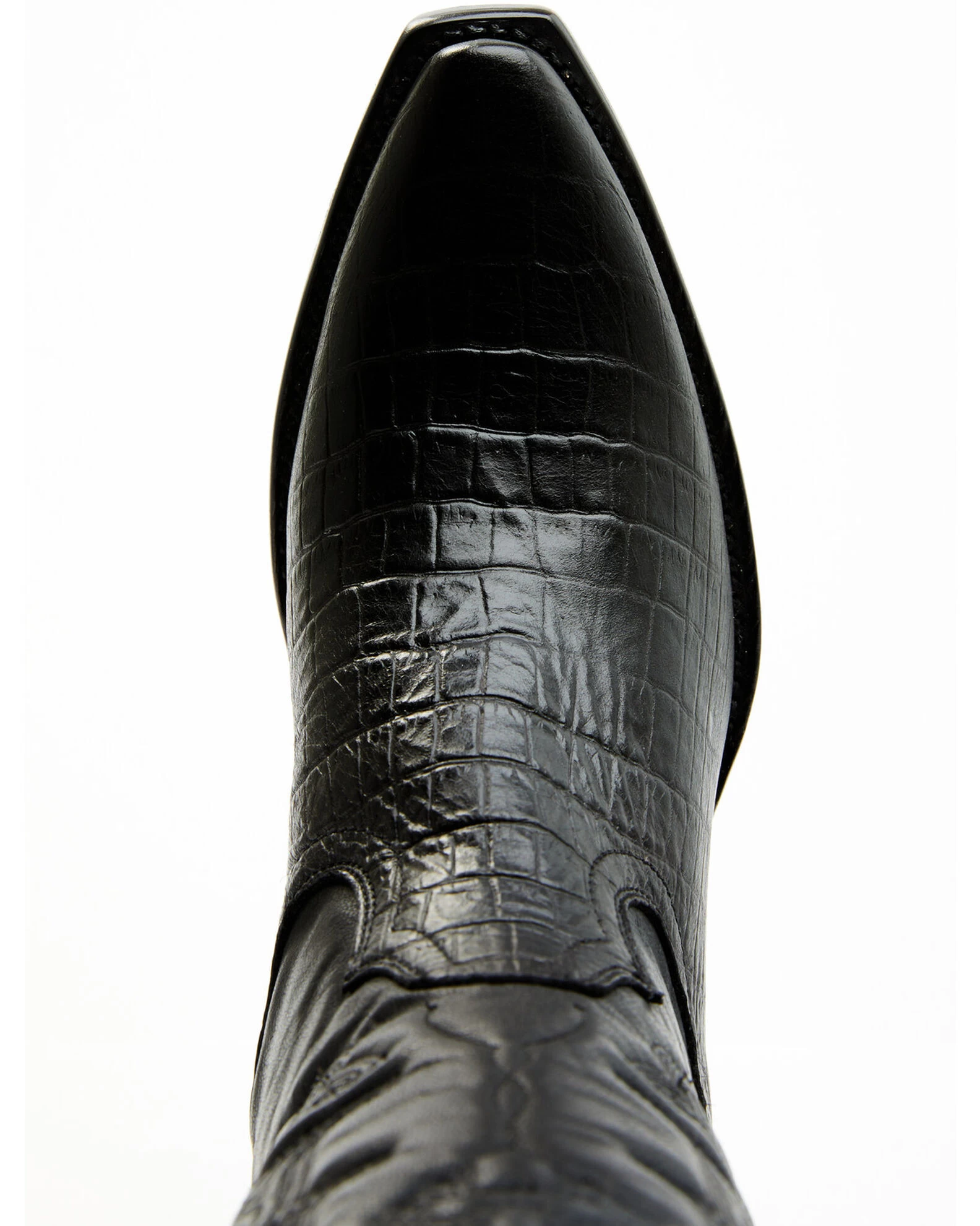 - Solid black with embossed crocodile print on vamp