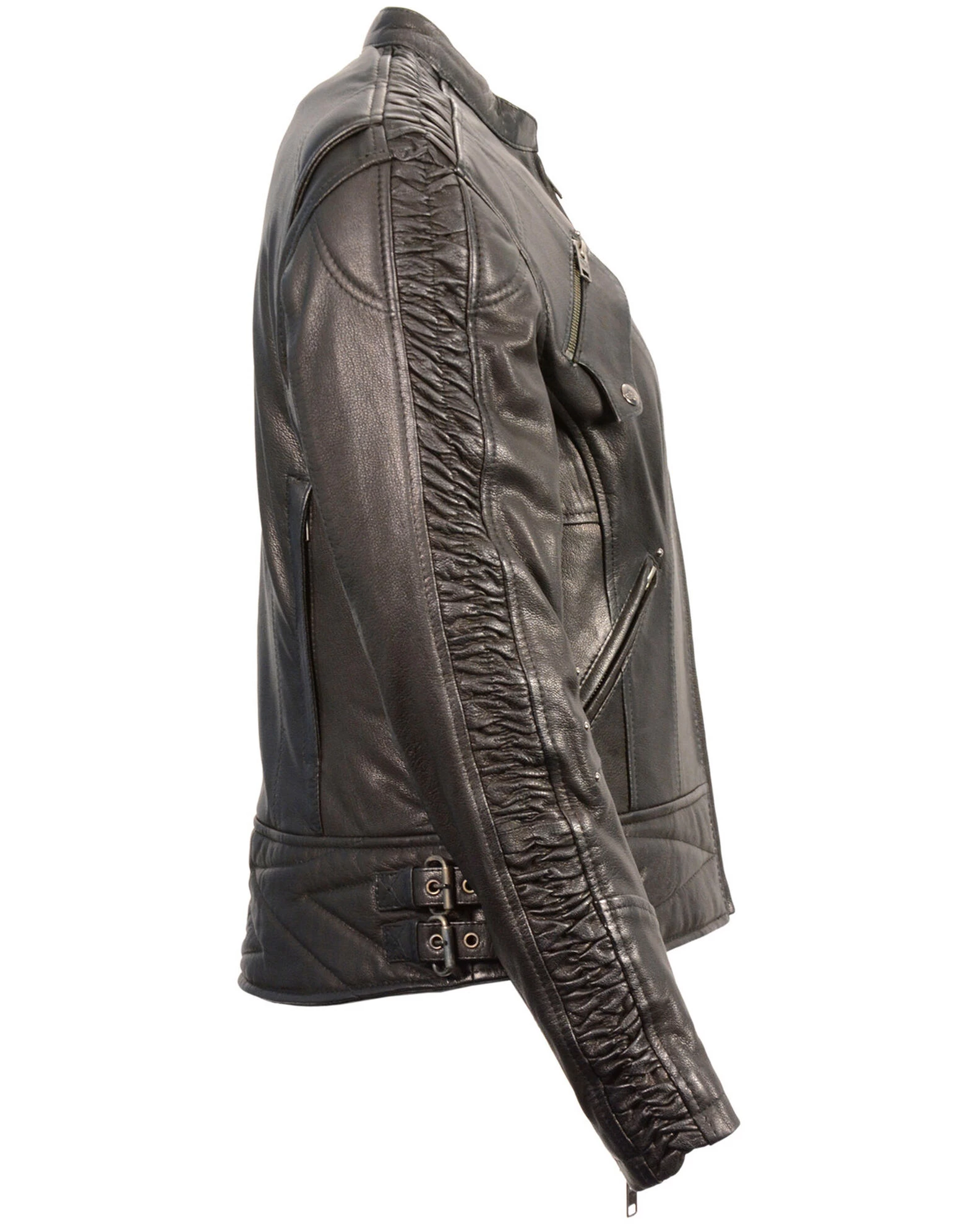 For style and protection on the open road, you can’t beat this lightweight racer jacket from Milwaukee Leather. It has contemporary styling with crinkle arm detail and double set side buckles for a custom fit. This jacket comes equipped with ample pockets for storage, including concealed weapon and media pockets, so you can always have your necessities close at hand. Ride in comfort and style with this cool racer jacket from Milwaukee Leather.