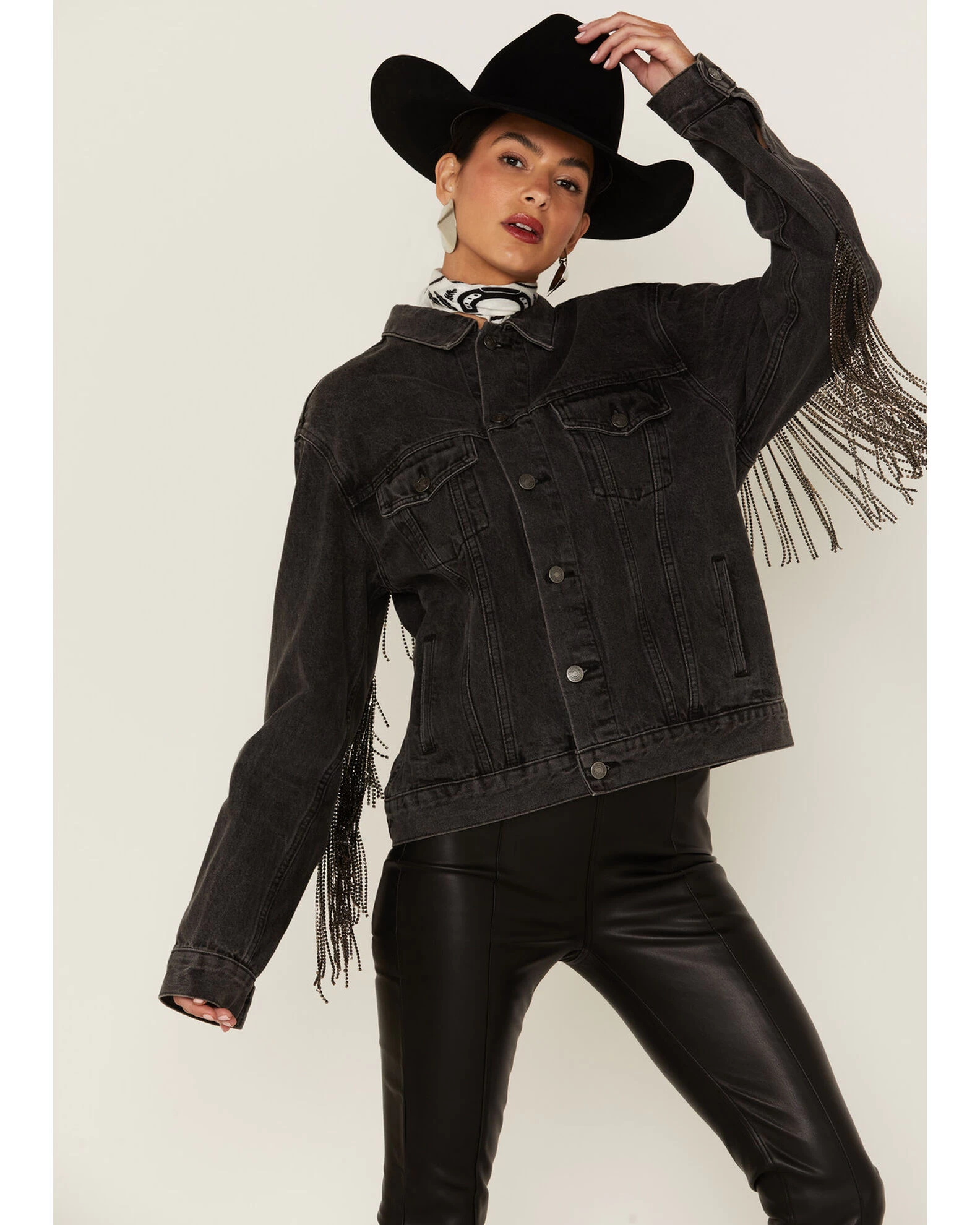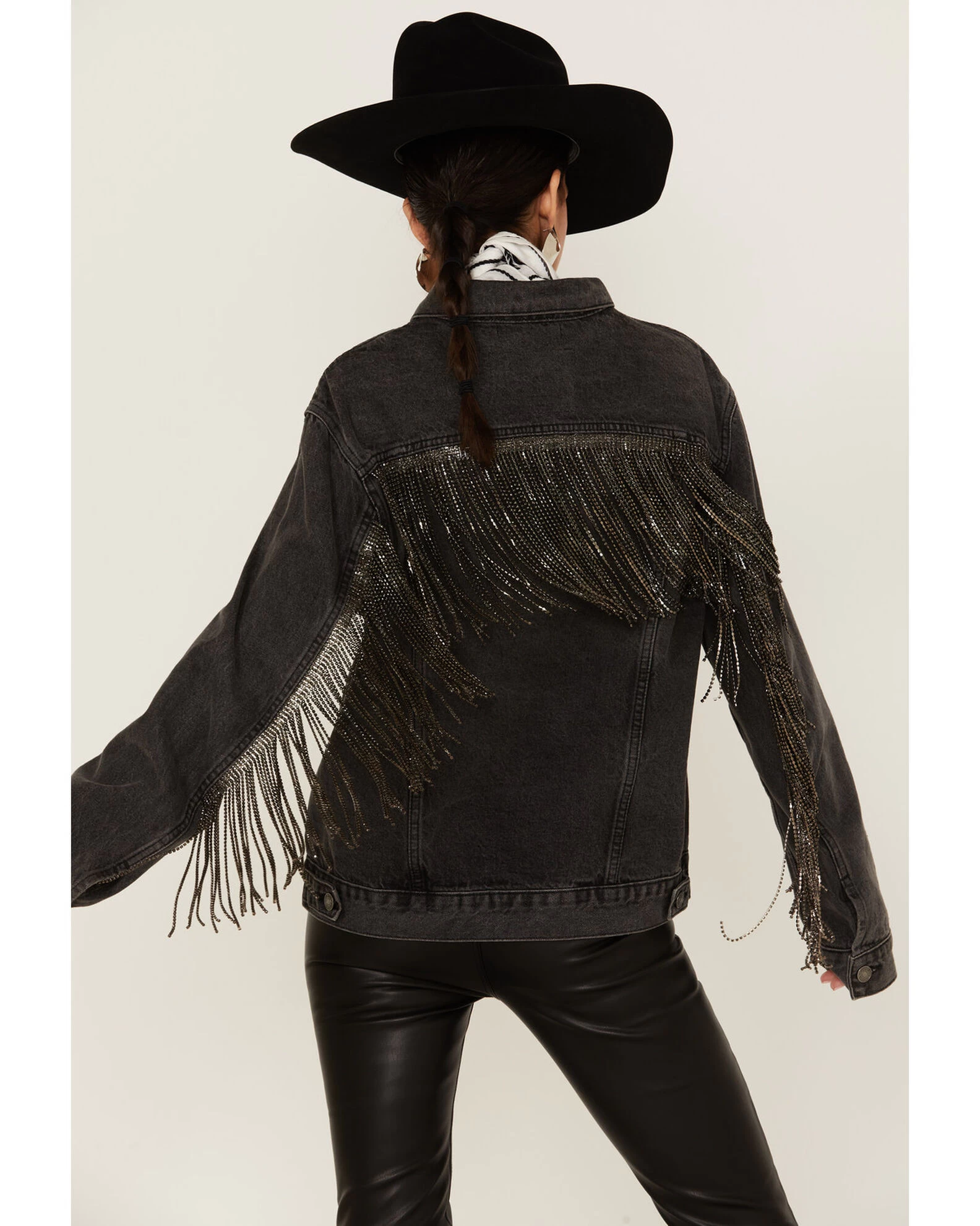 The Andy Jacket By DanielXDiamond: Women’s Gray Denim Jacket With Gunmetal Fringe
