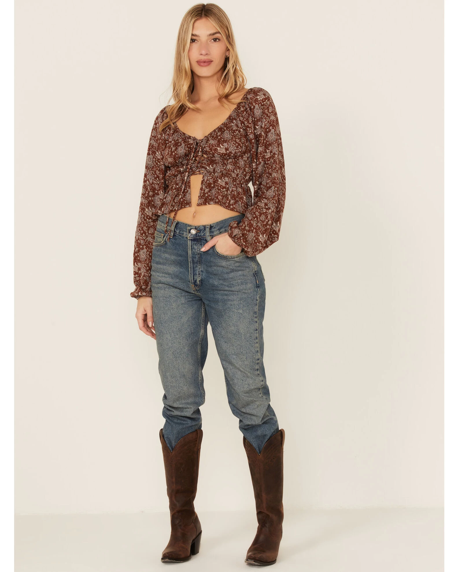 Wild Moss Long Sleeve Tie Front Ranched Floral Top